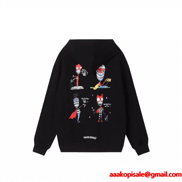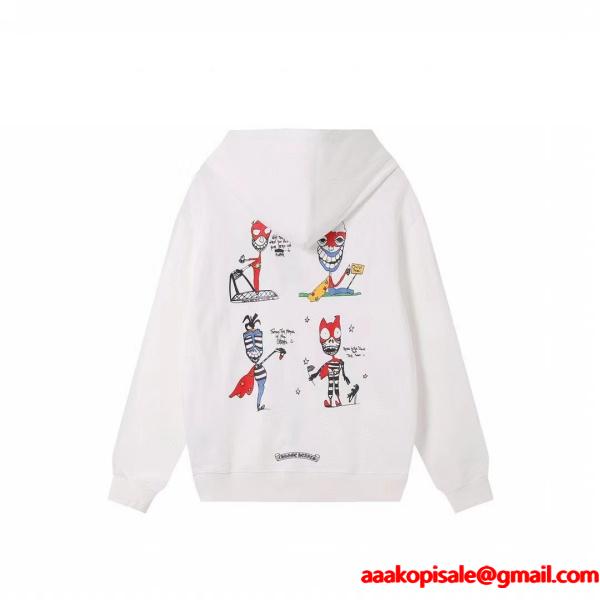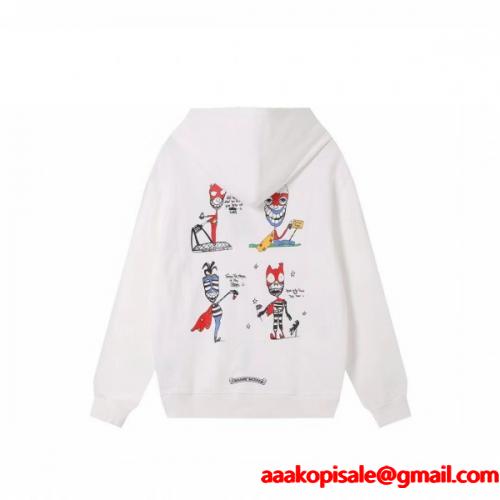 クロムハーツ スーパーコピー パーカー 可愛い 限定 キャラクター イラスト ホワイト CHROME HEARTS背面にユニークなキャラクターイラストをプリントしたクロムハーツの限定デザインであるCHROME HEARTS コピー パーカーは、遊び心あふれるアートスタイルで、カジュアルにもストリートにも映える一着です。高品質素材を使用し、柔らかく着心地も快適。スーパー コピーN級品の優良偽物として激安通販で人気上昇中。デザイン性の高さと細部の仕上げが際立つ、ファッション好き必見の注目パーカーです。