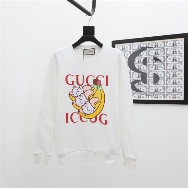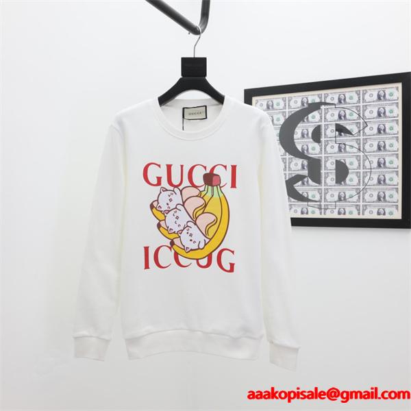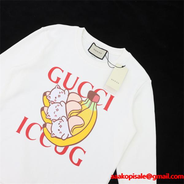 > メンズファッション > ジャケットパーカセーター > グッチ 偽物 人気爆発 ICCUG バナナキャット プリント スウェット トレーナー ホワイト おすすめ GUCCIパーカーは、バナナと猫のイラストが組み合わさった遊び心あふれるデザインが特徴です。GUCCI コピー パーカーとしてGUCCIロゴとICCUG文字が並び、グッチの独特なセンスを感じさせます。コピー品ながらプリントの発色と生地の質感は高品質で、着心地も抜群。通販では激安価格で販売され、優良なN級品として高い人気を誇ります。スーパー コピーの完成度が高く、偽物とは思えないほど洗練されたデザインが魅力の一着です。
