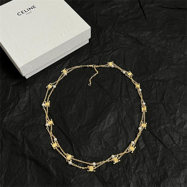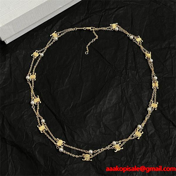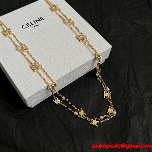 > アクセサリー > セリーヌ CELINE 偽物 2025秋冬 トリオンフパールモチーフロングネックレス 当店イチオシセリーヌ CELINE の象徴的なトリオンフモチーフを贅沢に連ねた、2025秋冬の最新ロングネックレス。CELINE コピー ネックレスは、繊細なゴールドチェーンにパールを散りばめ、優雅で女性らしい印象を演出します。軽やかで上品なデザインは、ジャケットやニットスタイルにも自然に馴染み、コーディネートを格上げ。二重巻きでチョーカー風に着用できるのも魅力。上質感あふれるCELINE風デザインで、デイリーにもフォーマルにも映える逸品です。