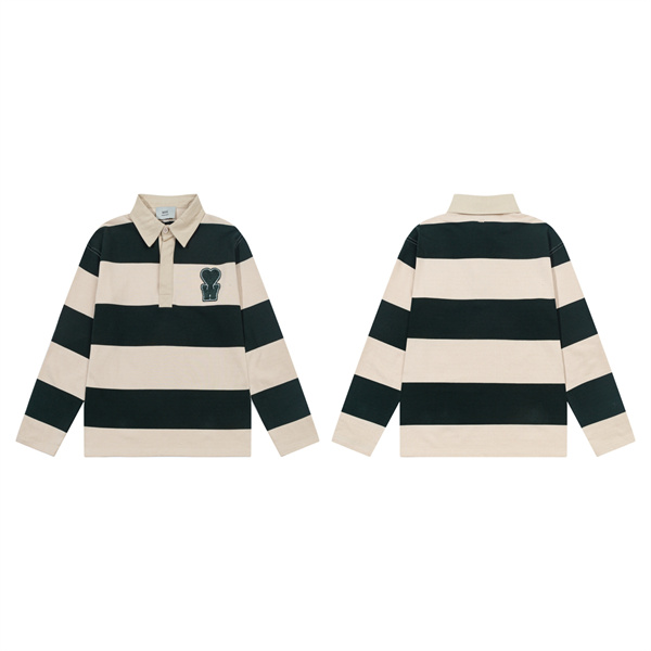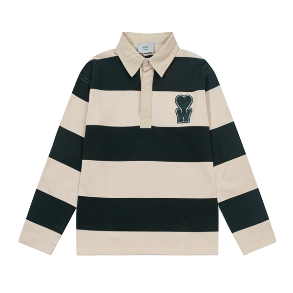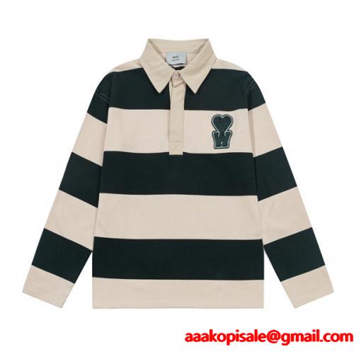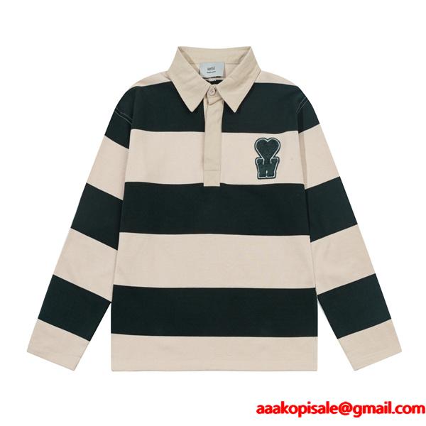 アミ パリスコピー ラガーシャツ 長袖 ポロシャツAMI PARIS ボーダー柄 ハート ロゴ 刺繍 ゆったり ストリート ファッション