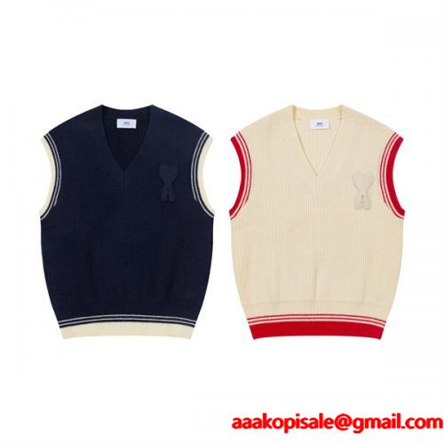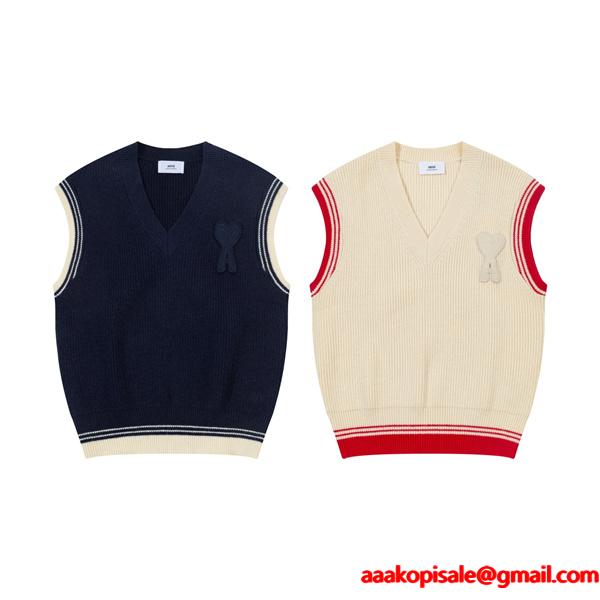 秋冬AMI PARISアミ パリス ニットベストコピー メンズ レディース Vネック ハート ロゴ 刺繍 スクール風 シンプル おしゃれ カジュアル 重ね着