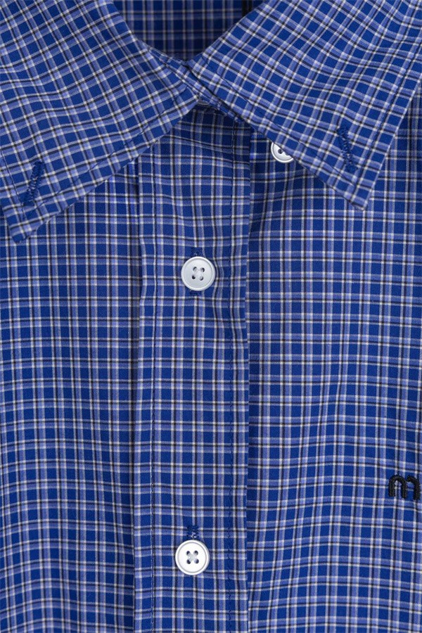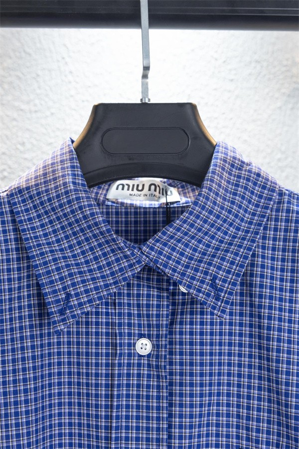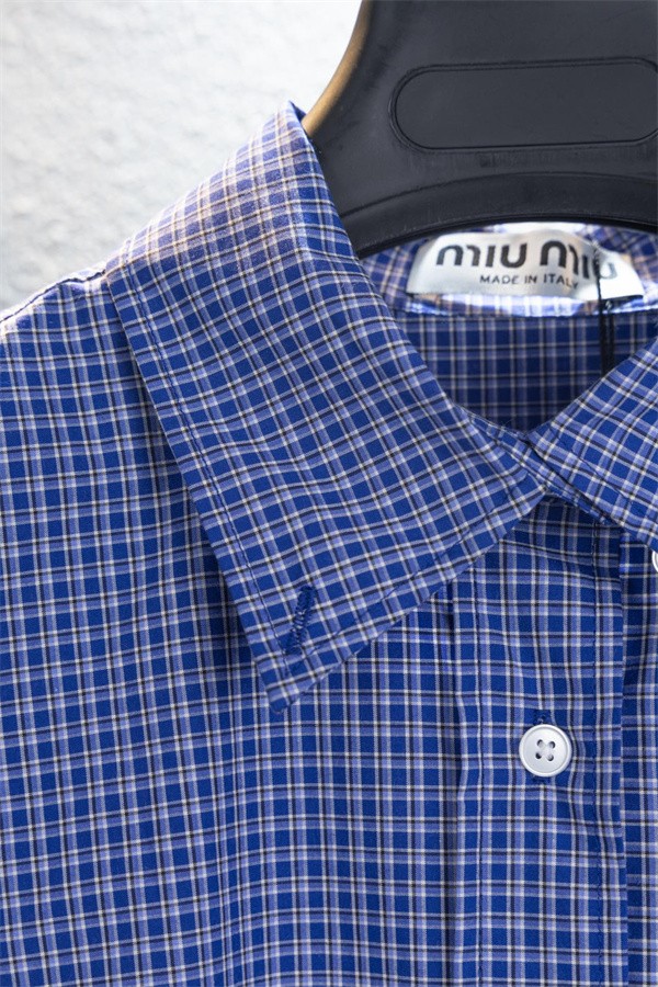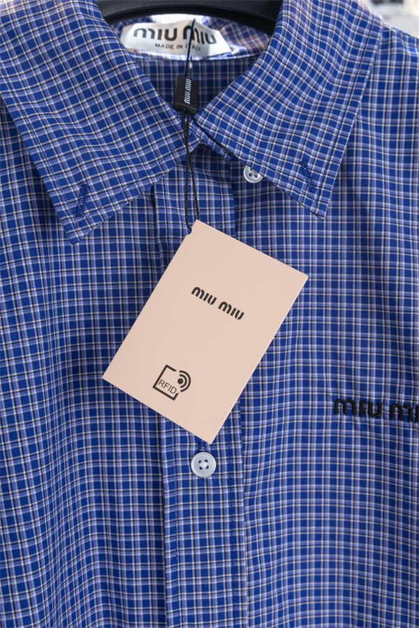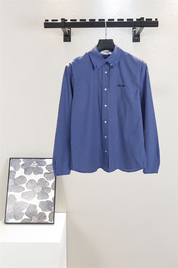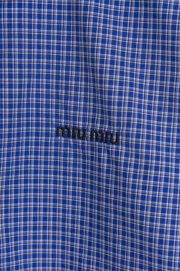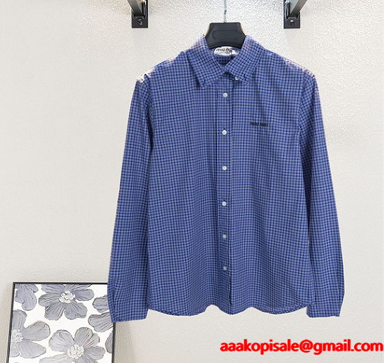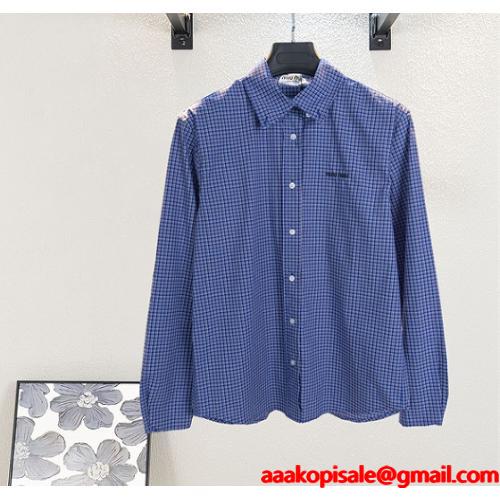 ミュウミュウ MIUMIUチェック シャツ コピー長袖 レディース ブルー ロゴ刺繍 カジュアル