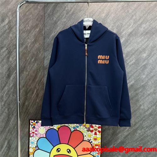 ミュウミュウ コピー パーカー ジップアップ ロゴプリント カジュアル モード系 ネイビー Miu Miu胸元にオレンジのロゴプリントを施した高品質N級品であるMiu Miu コピー パーカーは、シンプルながらブランドらしい個性を感じさせるデザインが特徴です。ミュウミュウ 偽物 通販で話題のスーパー コピー 激安モデルで、優良素材を使用した快適な着心地が魅力のカジュアルアイテムです。