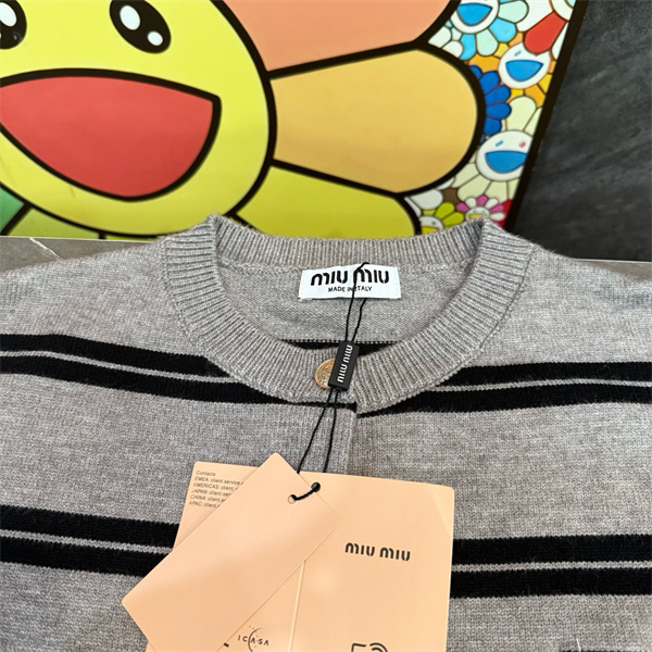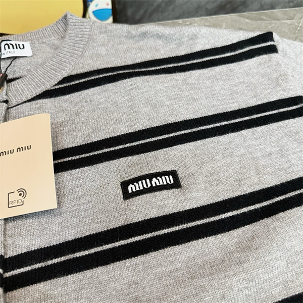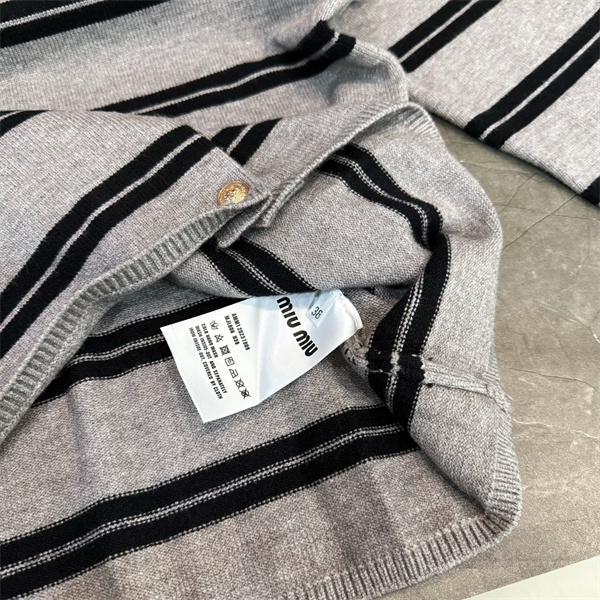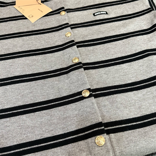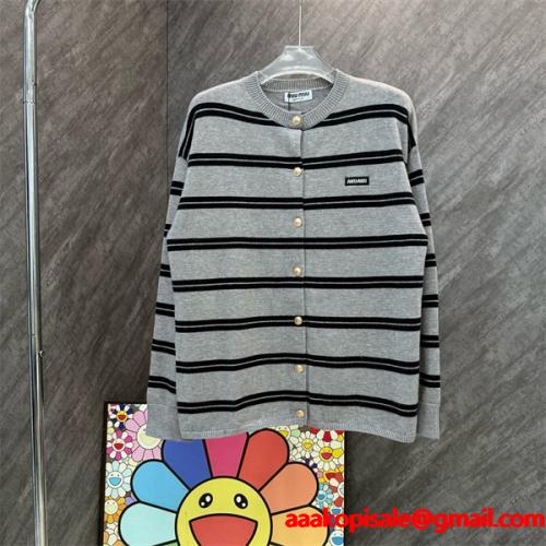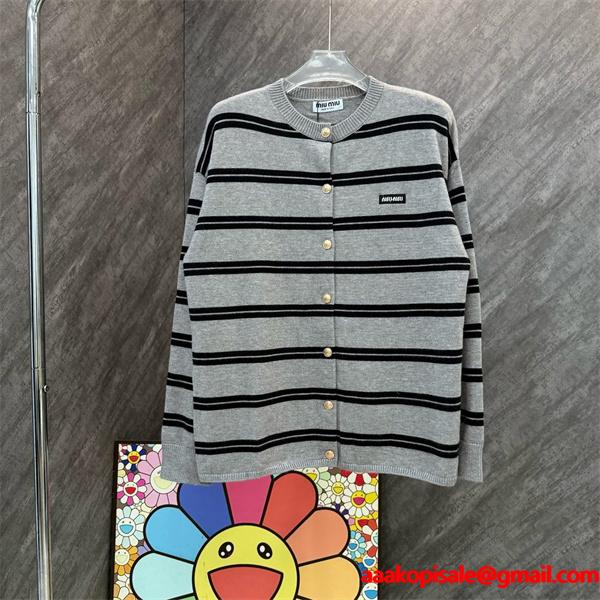 Miu Miu 偽物 カーディガン ボーダー ロゴワッペン デザイン 当店イチオシ グレー ミュウミュウ上品なグレー地にブラックのボーダーラインを配したモダンなデザインのMiu Miu コピー カーディガンは、胸元のロゴワッペンとゴールドボタンがアクセントの高品質N級品です。ミュウミュウ 偽物 通販でも人気のスーパー コピー 激安モデルで、優良素材を使用した快適な着心地を実現しています。