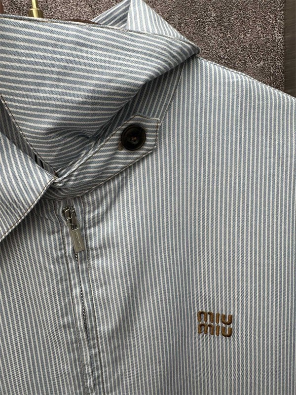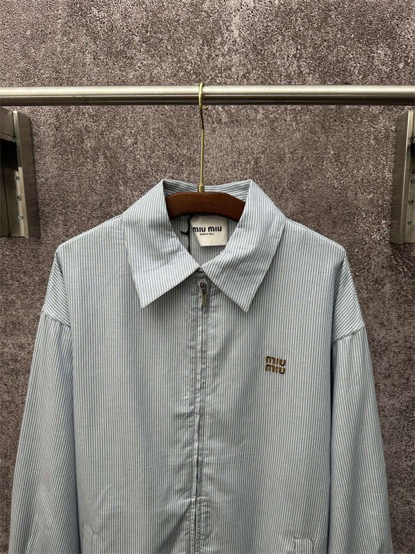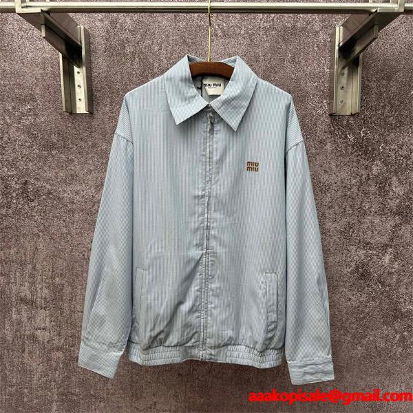 Miu Miu コピー ジャケット ストライプ ロゴ刺繍 ライトブルー シンプル ミュウミュウライトブルーのストライプ地に小さなロゴ刺繍をあしらった爽やかなデザインのMiu Miu コピー ジャケットは、軽やかで清潔感のある印象を与える高品質N級品です。ミュウミュウ 偽物 通販で高評価のスーパー コピー 激安モデルで、優良素材を使用し、快適な着心地を楽しめます。